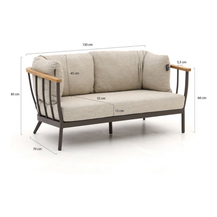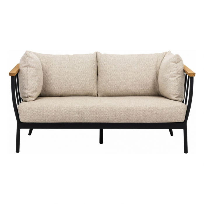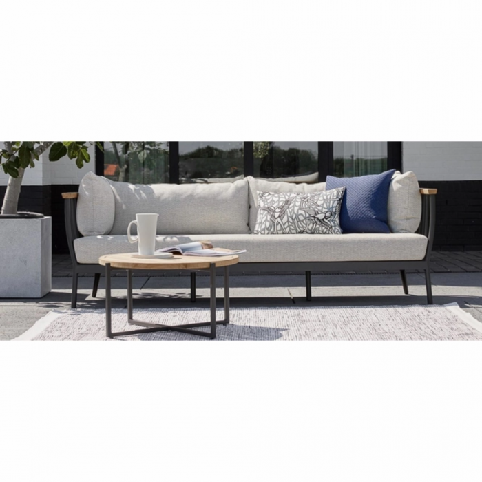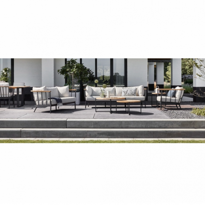 De Condor Lounge Sofa 150 van Applebee biedt een strakke en stoere uitstraling. Het aluminium frame met matzwarte poedercoating is sterk en lichtgewicht, terwijl de gecertificeerde teakhouten armleuningen een prachtige afwerking bieden.