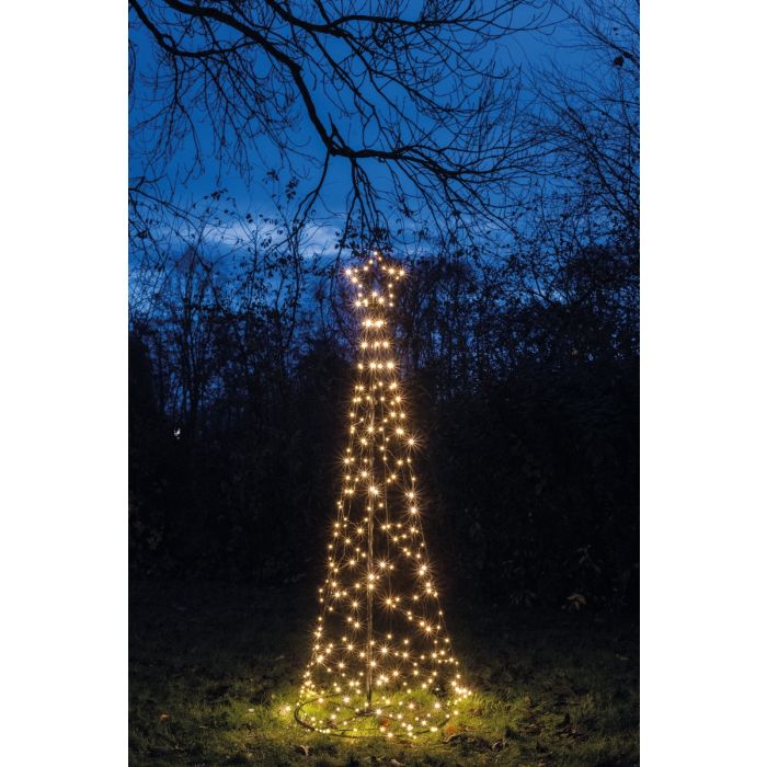 Deze verlichte boom met ster is 200 cm hoog en heeft een diameter van 70 cm. Voorzien van 236 warmwitte LED-lampjes en een 8/16 uur timer. Met een stevig frame, grondpennen en een 5 meter snoer is hij stabiel en flexibel te plaatsen. IP44-bescherming voor buitengebruik.