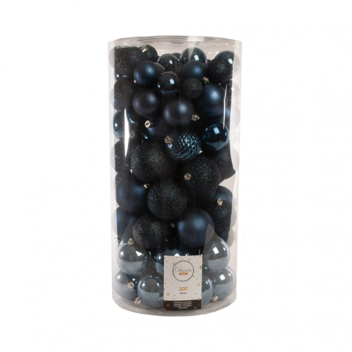 Creëer een sfeervolle kerst met een kerstboom vol prachtige kerstballen. Deze set van 100 onbreekbare blauwe kerstballen bestaat een divers aanbod van verschillende soorten kerstballen welke perfect op elkaar aansluiten. Erg leuk ter decoratie in de kerstboom of als accenten op een andere plek in huis.