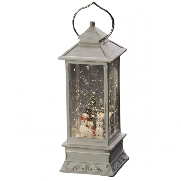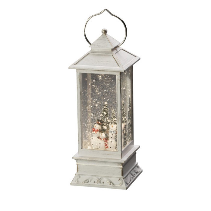 Deze sfeervolle LED kerstlantaarn van het Zweedse merk Konstsmide brengt een gezellige kerstsfeer in huis. Binnen in de watergevulde lantaarn staat een tafereel van vrolijke sneeuwpoppen, waarbij een motortje constant sneeuwvlokjes laat dwarrelen. Dit decoratieve stuk is vooral populair bij kinderen en zorgt voor een magisch effect tijdens de feestdagen.