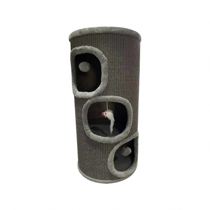 Deze krabton is 71 cm hoog en heeft een diameter van 39,5 cm. De ton heeft drie verdiepingen en drie gaten waar je katten in kunnen kruipen en spelen. De buitenkant is bedekt met krabtapijt, ideaal voor het slijpen van hun nagels. De bovenkant is voorzien van zachte pluche stof, waar katten lekker op kunnen zitten of liggen. Dit biedt je katten een plek om te krabben, spelen, en uit te rusten.