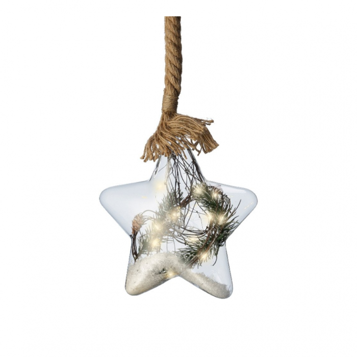 Deze prachtige kerstster is vervaardigd uit helder glas en zorgt voor een betoverende kerstsfeer. De 15 warm witte LED lampjes stralen een gezellig licht uit wanneer ze branden. De kerstster is subtiel bevestigd aan een juten touw en bevat niet alleen LED lampjes, maar ook kunstsneeuw en kersttakjes voor extra charme.