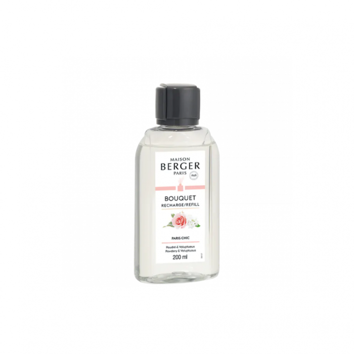De Navulling 200 ml Parfumverspreider Paris Chic van Maison Berger Paris laat je kennismaken met het stijlvolle en elegante Parijs. Dit subtiel bloemige parfum opent met een verfrissend boeket van citrusvruchten en neemt je mee naar een klassieke rozentuin waar de prachtige Bulgaarse roos naast de elegante iris en het onschuldige viooltje te vinden zijn. De moderne, exotische geur van lychee, versterkt door het zonnige aroma van wijnperzik, wordt benadrukt door de poederige zoetheid van muskus. Met dit poederige en weelderige huisparfum waan je je binnen no time in het hart van Parijs.