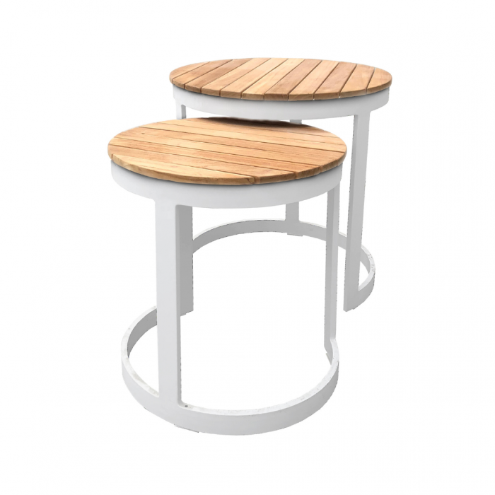 De tafelbladen zijn gemaakt van teakhout, een natuurlijk materiaal dat bekend staat om zijn duurzaamheid en weerbestendigheid. Het witte aluminium frame biedt niet alleen een stevige basis, maar geeft de bijzettafels ook een eigentijdse uitstraling die perfect past bij moderne buitenomgevingen.