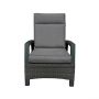 Het frame van de fauteuil is gemaakt van aluminium, wat sterk en duurzaam is. Het wicker vlechtwerk rondom het frame zorgt voor een stevige constructie en een moderne uitstraling. Omdat aluminium niet roest, blijft de fauteuil er lang mooi uitzien, zelfs na blootstelling aan regen en zon.
