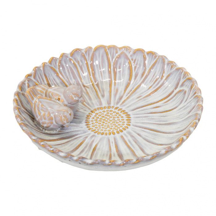 De Village Vogeldrinkschaal Flower Pearl is een keramieken bloemvormige schaal van 28 cm, met vogelfiguurtjes, geschikt om tuinvogels in lente, zomer en herfst van vers drinkwater te voorzien.